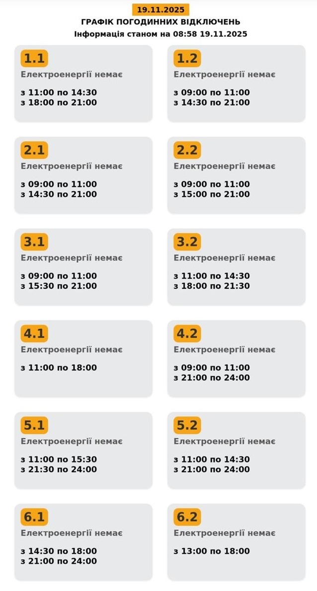 Наразі відомо про такий графік відсутності електроенергії у споживачів: