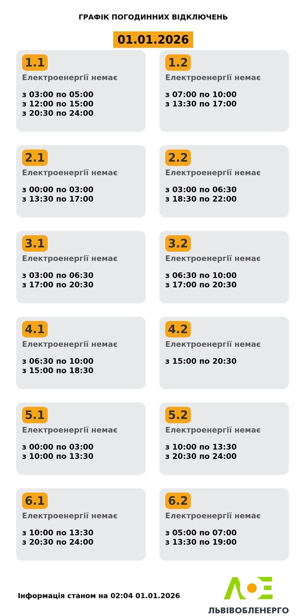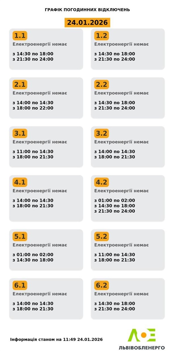 Зранку 23 грудня Україна зазнала чергової ракетно-дронової атаки зі сторони росії. Під час неї найбільше постраждали енергооб'єкти на заході країни. Близько 10:00 на Львівщині застосували аварійні відключення світла. Після цього обленерго опублікувало графік планових відключень, який має працювати з 12:00, якщо до того часу вдасться стабілізувати ситуацію в енергетичній системі.